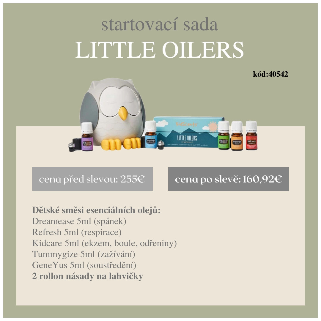 Kolekcia 5 zmesí esenciálnych olejov špeciálne vytvorených pre našich najmenších s difuzérom Sovička.
